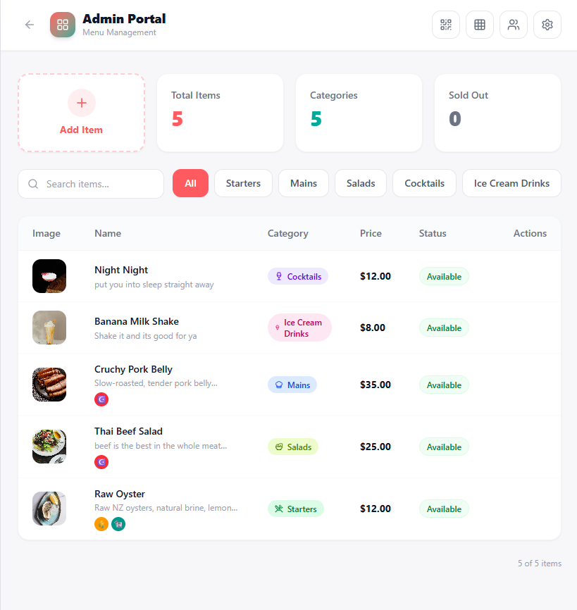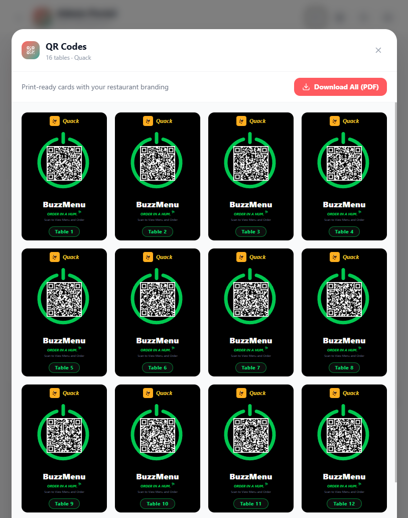 The system auto-generates QR codes. Tape them to your Cafe tables or hand out physical Number Tents.