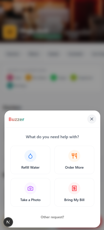 No more waving across a loud room. Guests can silently ping waiters for water refills, custom requests, or bill delivery directly to the Waiter's Dashboard or iPad.